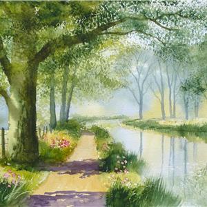 Riverside Path -  Based from views along the Basingstoke canal, with its miles and miles of beautiful scenes to paint. Create atmospheric distance, trees, foliage, dappled sunlight, water and reflections, as well as flowers along the footpath.