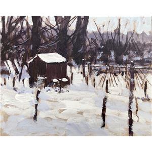 I like the way the broad brush strokes give the impression that the snow is blowing against the posts, it seems to suggest movement. Painted spontaneously and entirely in one sitting this small painting is one of my favourites.