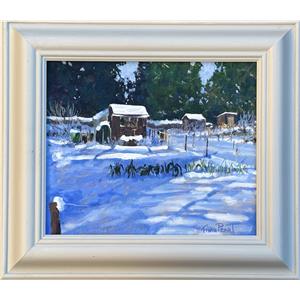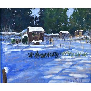 I so enjoy painting allotments, especially after a snowfall but what struck me about this one was the shaft of sunlight contrasting the leeks in bright light with those in shadow.