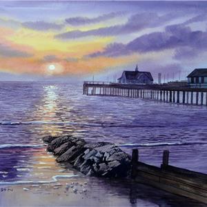 This early evening painting features a pier as seen from the beach, the sunlight setting on the water at the end of the day reflecting the warm orange glow as the focal point of the painting.