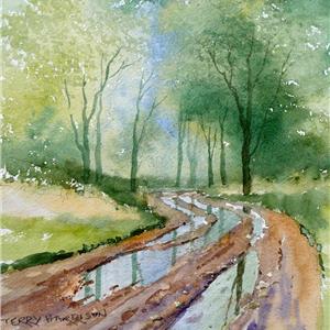This little painting includes lovely wet into wet distance, Summer foliage and reflections of the trees in the puddles on the track.