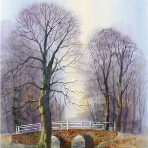 Terry loved painting trees in all seasons and weather. We had an annual membership to an Arboretum not far from us, and we would walk there just to admire the huge trees in wonderful settings. This painting emphasises the winter light falling onto the tree trunks and bridge.