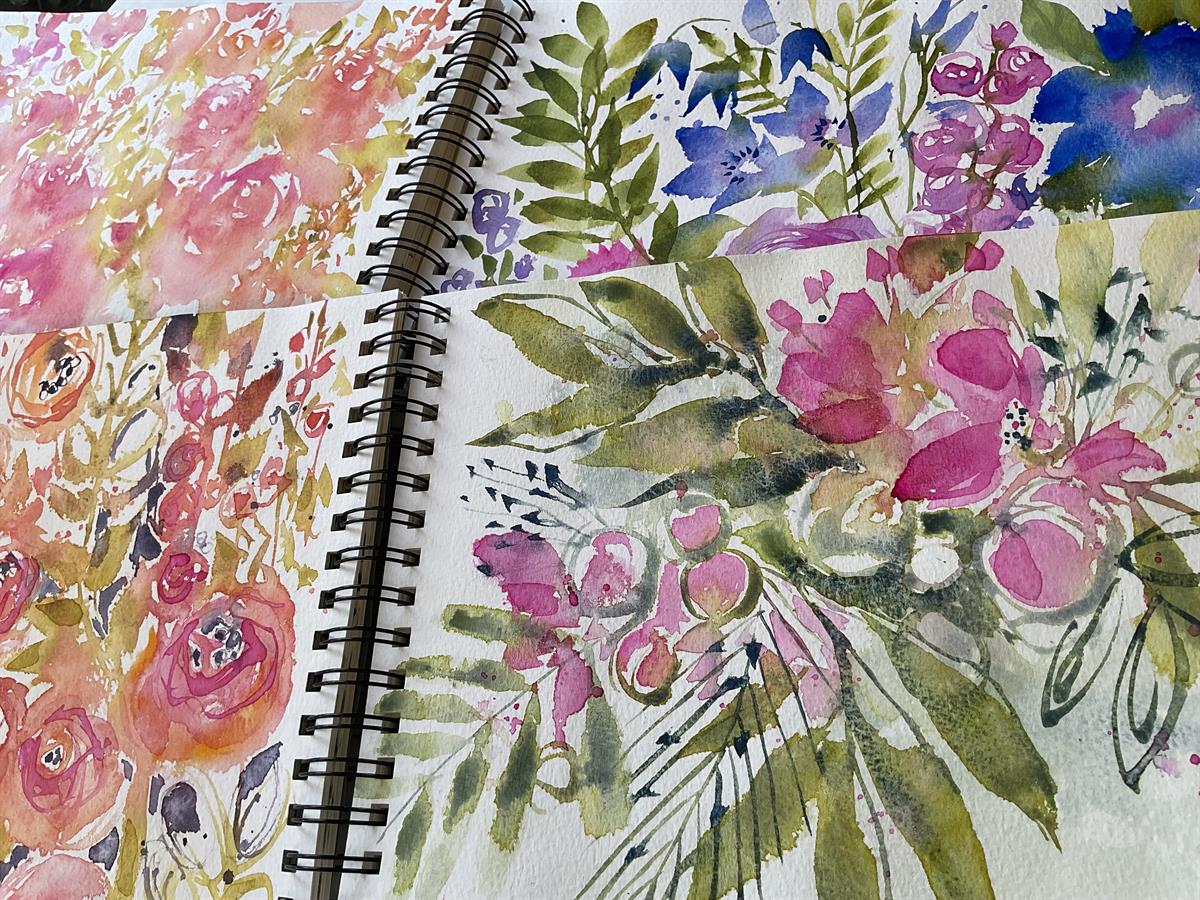 Blowsy Blooms - let go and adjust your work, adapting to what happens with each brush stroke, using wet watercolour techniques, multiple brushes and encouraging the colours to meet, merge and run a little.