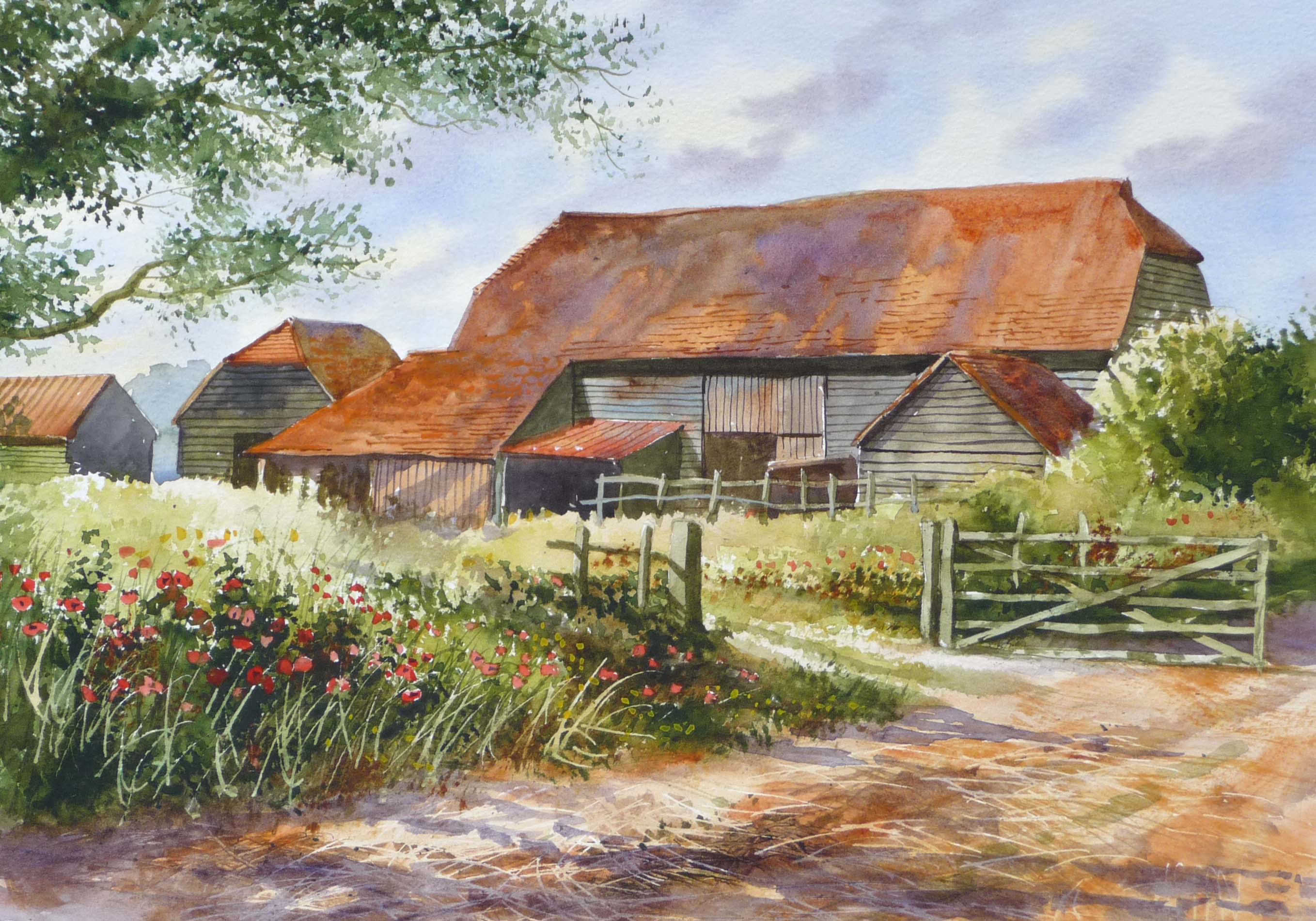 Classic landscape watercolour is primarily all about suggestion rather than description. You’re not trying to paint every leaf or brick. Rather you are aiming to try and capture the feeling of the place. To convey a feeling of what the weather, the distance and the atmosphere is in the scene you are painting  Take this Terry Harrison scene. The sun is obviously from above and to the left creating that dappled shade on the ground which almost appears to be moving. The moody sky has a touch of darker shadow giving us the impression of a blustery and changeable day. Note how Terry has changed the value of the bright red blooms to emphasise those captured in the dappled shade. The atmosphere is all delivered through an attention to the light and its highlights and shadows. You can even tell where Terry has used the paper and masking fluid to deliver bright white highlights. What makes a Classical Landscape Watercolour? Whilst there are many different sub categories within classical landscape, here are a few of the common themes which appear: - Using the bare paper as your brightest highlight: by leaving the raw paper visible it becomes the brightest part of the image which when used effectively (and sparingly), will give the painting a natural luminosity.