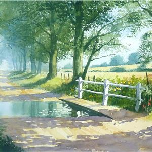 The Ford - The trees along this shady lane forms a hazy tunnel that leads you forward into the painting, but first you musy negotiate the ford but fortunately there is a wooden footbridge to help you keep your feet dry and provides a sun dappled focal point.
