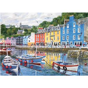 With its brightly coloured houses and buildings, Scottish Gaelic ‘Tobar Mhoire’ is the home to whisky, Balamory, Highland games and wildlife excursions.Arguably one of Terry Harrison's more bright and colourful paintings, Tobermory's vibrant houses are reflected in the rippling water as the boats bob gently in the harbour.Tobermory is the capital of, and the only burgh on, the Isle of Mull in the Scottish Inner Hebrides. It is located in the northeastern part of the island, near the northern entrance of the Sound of Mull. Legend has it that the wreck of a Spanish galleon, laden with gold, lies somewhere in the mud at the bottom of Tobermory Bay - although the ship's true identity, and cargo, are in dispute. By some accounts, the Florencia is a member of the defeated Spanish Armada. Fleeing the English fleet in 1588, it anchored in Tobermory to take on provisions. Following a dispute over payment, the ship caught fire and the gunpowder magazine exploded, sinking the vessel. In her hold, reputedly, was £300,000 in gold bullion, however no significant treasure has ever been recovered in Tobermory Bay.