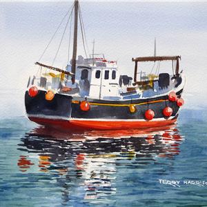 This delightful painting features an old boat adorned with buoys reflecting in the still water of the harbour.