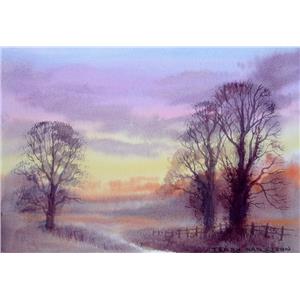 The winter trees in the misty foreground stand proud against this beautiful late afternoon sky. A delightful winter painting full of colour.