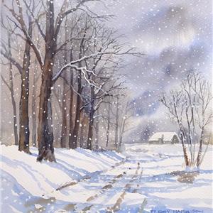 This is one of the few paintings Terry painted which includes falling snow and each snowflake is individually applied. The lovely colour combinations give a wonderful depth, suggesting colder weather on the way, whilst the foreground is brighter with the lovely blue shadows.